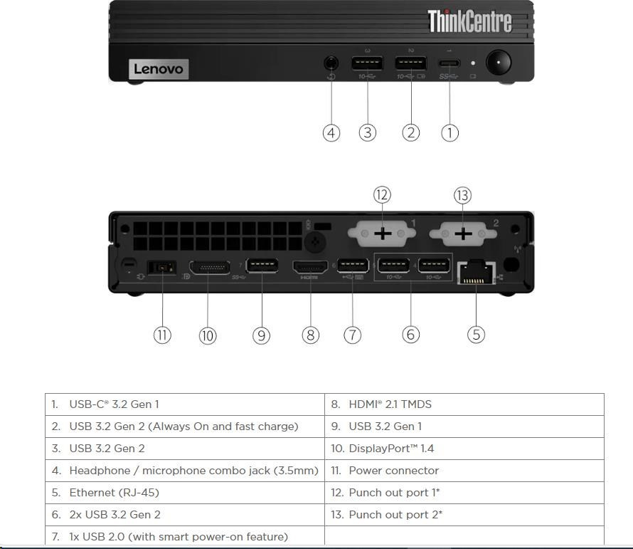 Predné porty | 1x USB-C® 3.2 Gen 1 (support data transfer and 5V@0.9A charging) 1x USB 3.2 Gen 2 1x USB 3.2 Gen 2 (Always On and 5V@2.1A charging) 1x headphone / microphone combo jack (3.5mm) |