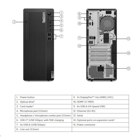 | Predné porty | 1x USB-C® (USB 5Gbps / USB 3.2 Gen 1), with 15W charging 4x USB-A (USB 5Gbps / USB 3.2 Gen 1) 1x headphone / microphone combo jack (3.5mm) 1x microphone (3.5mm) |