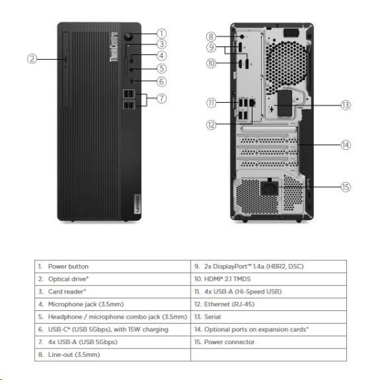 | Predné porty | 1x USB-C® (USB 5Gbps / USB 3.2 Gen 1), with 15W charging 4x USB-A (USB 5Gbps / USB 3.2 Gen 1) 1x headphone / microphone combo jack (3.5mm) 1x microphone (3.5mm) |