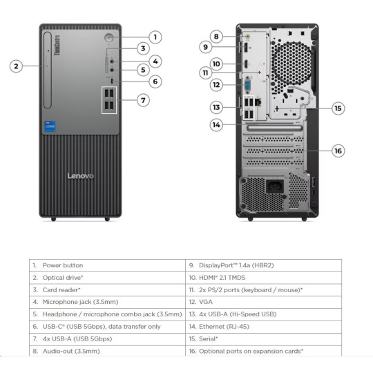 | Predné porty | 1x USB-C® (USB 5Gbps / USB 3.2 Gen 1), with data transfer and 15W charging 4x USB-A (USB 5Gbps / USB 3.2 Gen 1) 1x headphone / microphone combo jack (3.5mm) 1x microphone (3.5mm) |