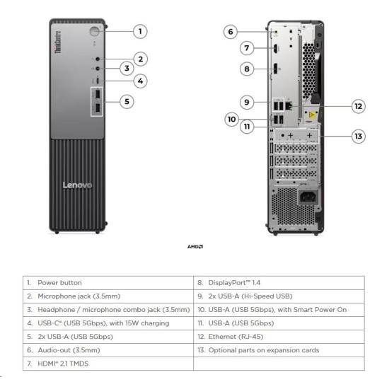 | Zadné porty | 2x USB-A (Hi-Speed USB / USB 2.0) 2x USB-A (USB 5Gbps / USB 3.2 Gen 1), one supports Smart Power On 1x HDMI® 2.1 TMDS 1x DisplayPort™ 1.4 1x Ethernet (RJ-45) 1x line-out (3.5mm) |
