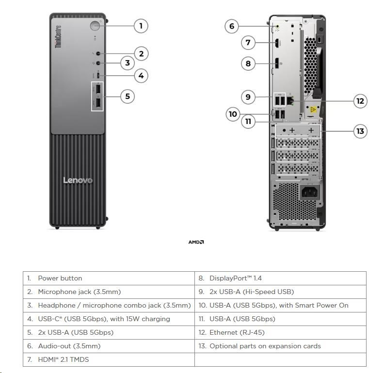 | Zadné porty | 2x USB-A (Hi-Speed USB / USB 2.0) 2x USB-A (USB 5Gbps / USB 3.2 Gen 1), one supports Smart Power On 1x HDMI® 2.1 TMDS 1x DisplayPort™ 1.4 1x Ethernet (RJ-45) 1x line-out (3.5mm) |