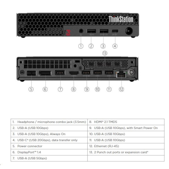 | Zadné porty | 1x USB-A (USB 5Gbps / USB 3.2 Gen 1) 3x USB-A (USB 10Gbps / USB 3.2 Gen 2), one supports Smart Power On 1x HDMI® 2.1 TMDS 1x DisplayPort™ 1.4 1x Ethernet (RJ-45) |