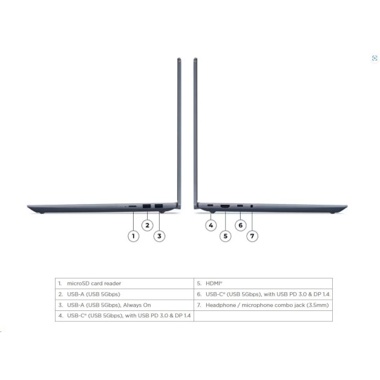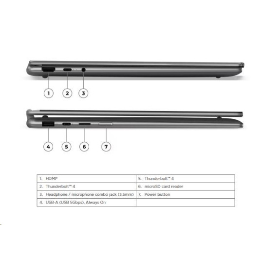 | Standartné porty | 1x USB-A (USB 5Gbps / USB 3.2 Gen 1), Always On 2x USB-C® (Thunderbolt™ 4 / USB4® 40Gbps), with USB PD 3.0 and DisplayPort™ 2.1 1x HDMI® 1.4b 1x Headphone / microphone combo jack (3.5mm) 1x microSD card reader |