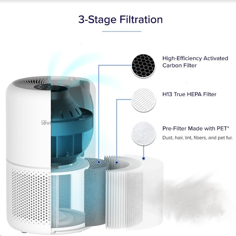 Druhou vrstvou je HEPA filter H13. To odlišuje Levoit od konkurencie, pretože filter HEPA H13 je oveľa kvalitnejší a spoľahlivejší ako bežne používané HEPA H11. Tu sa odfiltrujú jemné prachové častice, pleseň, baktérie, peľ, dymové častice, roztoče a srsť.