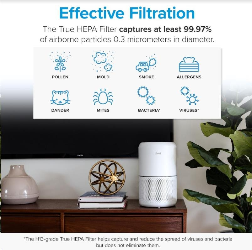 Druhou vrstvou je HEPA filter H13. To odlišuje Levoit od konkurencie, pretože filter HEPA H13 je oveľa kvalitnejší a spoľahlivejší ako bežne používané HEPA H11. Tu sa odfiltrujú jemné prachové častice, pleseň, baktérie, peľ, dymové častice, roztoče a srsť.