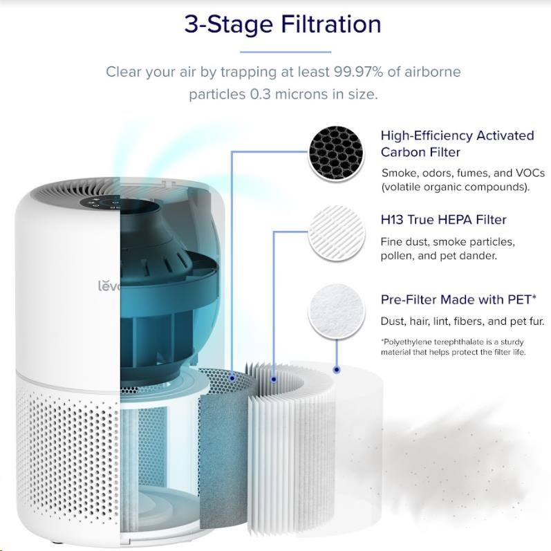 Druhou vrstvou je HEPA filter H13. To odlišuje Levoit od konkurencie, pretože filter HEPA H13 je oveľa kvalitnejší a spoľahlivejší ako bežne používané HEPA H11. Tu sa odfiltrujú jemné prachové častice, pleseň, baktérie, peľ, dymové častice, roztoče a srsť.