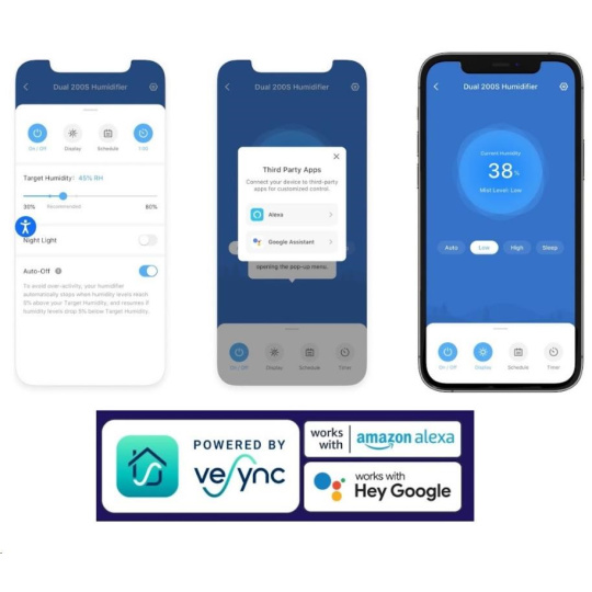 Zvlhčovač vzduchu Levoit Duall200S Smart je možné ovládať priamo na prehľadnom podsvietenom LED displeji alebo aj cez aplikáciu na chytrých zariadeniach Apple alebo Android. Alebo si ho môžete dokonca pripojiť do svojho Smart Home a ovládať hlasom cez Google Assistant alebo Amazon Alexa. Senzor vlhkosti zobrazuje vlhkosť v reálnom čase av automatickom režime tak okamžite reaguje na zmeny vlhkosti. Vždy by sa malo jednať o rozmedzie medzi 40 % až 60 %. Cez aplikáciu si môžete informácie kontrolovať alebo si svoje režimy plánovať.