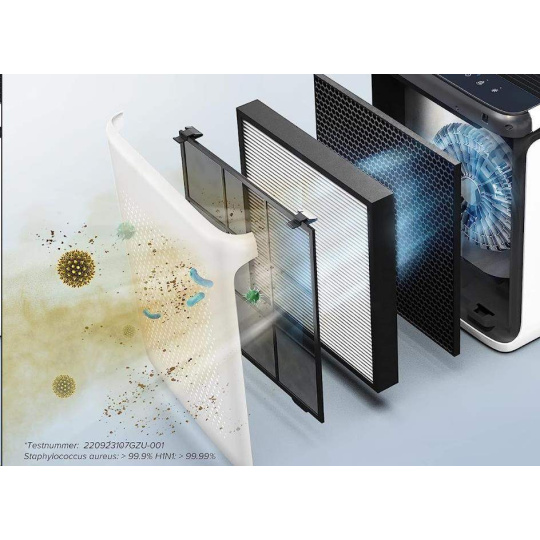 Druhou vrstvou je H13 True HEPA filter s technológiou HEPASmart™. Vylepšený staticky nabitými vláknami, ktoré zachytia najmenej 99,97 % častíc prenášaných vzduchom o veľkosti 0,3 mikrónu, ako sú jemný prach, častice dymu, plesne, baktérie, peľ, dymové častice, roztoče, a zvieracia srst. To odlišuje Levoit od konkurencie, pretože filter HEPA H13 je oveľa kvalitnejší a spoľahlivejší než bežne používané filtre. Nezávislé testovanie 220923107GZU-001.