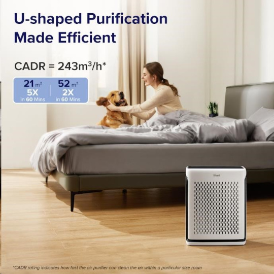 Levoit Vital 100S disponuje výkonom až 243 m3/h CAD a vyčistí dvojmo miestnosť o veľkosti až 52 m2 a až päťkrát za hodinu miestnosť o veľkosti 21 m2.