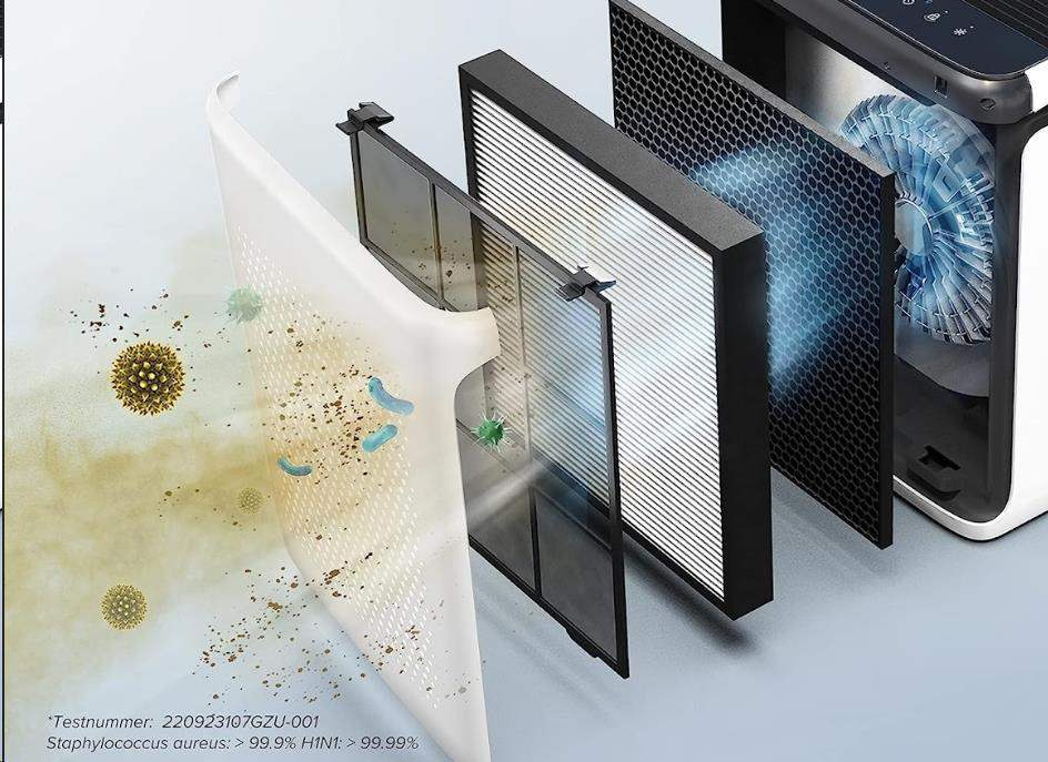 Druhou vrstvou je H13 True HEPA filter s technológiou HEPASmart™. Vylepšený staticky nabitými vláknami, ktoré zachytia najmenej 99,97 % častíc prenášaných vzduchom o veľkosti 0,3 mikrónu, ako sú jemný prach, častice dymu, plesne, baktérie, peľ, dymové častice, roztoče, a zvieracia srst. To odlišuje Levoit od konkurencie, pretože filter HEPA H13 je oveľa kvalitnejší a spoľahlivejší než bežne používané filtre. Nezávislé testovanie 220923107GZU-001.
