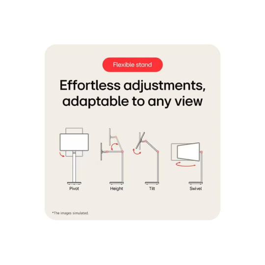 Náš chytrý monitor je vybavený flexibilným stojanom s torzným pántom, ktorý umožňuje nastavenie náklonu, otáčania, výšky aj režimu na výšku pre jednoduché prispôsobenie pozorovacieho uhla. Silná štvorcová základňa zabezpečuje stabilitu a elegantné šedo-biele prevedenie sa hodí do každého interiéru – doma aj v práci.