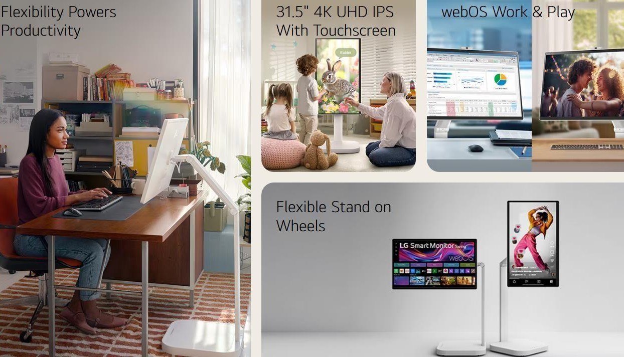 Zažite výnimočnú flexibilitu s LG Smart monitorom s dotykovou obrazovkou, ktorý je vybavený pojazdným stojanom pre ideálne nastavenie v rôznych uhloch a polohách. Užite si plynulé ovládanie dotykom, veľký 31,5-palcový displej a ohromujúci obraz vo 4K rozlíšení – pre prácu aj zábavu.