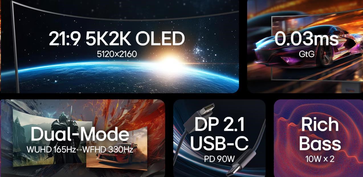 UltraGear™ OLED s rozlišením 5K2K WUHD, obnovovací frekvencí 165 Hz nebo WFHD v duálním režimu 330 Hz, odezvou 0,03 ms, kompatibilní s G-sync