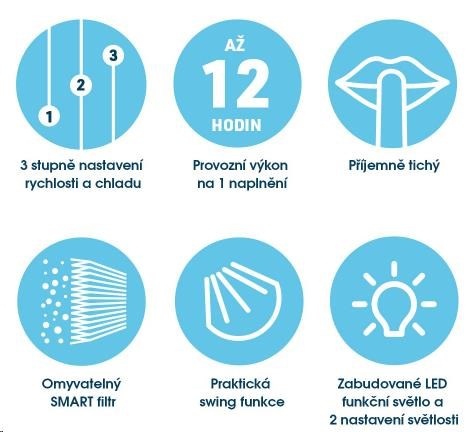 Malý a výkonný - najjednoduchší spôsob, ako sa ochladiť a osviežiť Praktická otočná funkcia rovnomerne rozdelí studený vzduch vo vašom okolí Až 12 hodín chladenia pomocou jediného naplnenia nádrže Omyvateľný SMART filter Chladí a zvlhčuje vzduch pomocou čistej vody - úplne bez chémie Extrémne nízka spotreba energie, vysoký stupeň chladenia 3 stupne nastavenia chladenia a rýchlosti: ideálne sa prispôsobí vašim potrebám Zabudované LED nočné svetlo s 2 stupňami nastavenia intenzity Príjemne tichý: ideálny do spálne, detskej izby alebo kancelárie Není potrebná žiadna montáž, stačí zapojiť do bežnej zásuvky Kompaktný a prenosný: ochladí vzduch tam, kde ho potrebujete ORIGINÁL známy z TV! Po viac ako milióne predaných mini ochladzovačov vzduchu Arctic Air je MediaShop späť s ďalším ochladzovačom vzduchu budúcnosti, ktorý ochladí vzduch bez chémie: je tu Livington SmartCHILL! Je to geniálna mini veža s obrovskou chladivou silou! Dvakrát väčší a viac ako dvakrát tak silný ako jeho konkurencia! Livington SmartCHILL - váš osobný, vylepšený systém chladenia, ktorý premení horúci a vydýchaný vzduch v každej miestnosti na príjemnú, chladnú oázu. A to najlepšie: Livington SmartCHILL spotrebuje menej energie než bežná žiarovka šetriaca energiu. Jeho tajomstvo spočíva v hydro-chill technológii: horúci vzduch nasačuje do prístroja, Livington SmartCHILL ho orosí kvapky studenej vody a zároveň SMART filter ochladí, takže von ide čistý, svieži, chladný vzduch. Mini veža funguje úplne ticho a pomocou jedného naplnenia nádrže funguje až 12 hodín! Je ideálny počas horúcich letných dní a nocí - chladnejší, čistejší a vlhší vzduch znamená pre vás hlboký spánok, pri ktorom si odpočinete! Je úplne jedno, kde sa počas horúceho leta nachádzate, Livington SmartCHILL vám zabezpečí studený, svieži vzduch v obývačke, horúcej kuchyni, prehriatej spálni, v detskej izbe, dusnej kancelárii alebo dielni, a vy sa vždy budete cítiť príjemne. Naplňte prístroj Livington SmartCHILL jednoducho studenou vodou, stlačte tlačidlo na zapnutie a prístroj bude fungovať neuveriteľných 12 hodín na jedno naplnenie! Náš tip: Čím chladnejšiu vodu naplníte do prístroja, tým výraznejší bude efekt chladenia. Do vody môžete tiež pridať kocky ľadu, dosiahnete tým ešte lepší účinok. Vďaka trom stupňom nastavenia chladu a rýchlosti môžete počas najsilnejších letných dní cítiť vo svojom okolí príjemný, chladný vzduch. Okrem toho je prístroj vybavený funkciou otáčania: takže ochladenie budete cítiť presne tam, kde to potrebujete. Livington SmartCHILL je oveľa tichší než napríklad bežný ventilátor, a to aj napriek tomu, že vzduch ochladzuje, nielen profukuje. Prístroj má tiež zabudované nočné LED svetlo s dvomi nastaveniami intenzity. Vy a celá vaša rodina konečne pokojne prespíte celú noc! Prístroj funguje pomocou čistej vody, úplne bez chémie, je šetrný k životnému prostrediu a extrémne šetrí elektrickú energiu. Technické informácie: Výška: 30,6 cm, Priemer o 21,1 cm Input: 100-240V ~ 50 / 60Hz 0.4A Max Output: 12V 1.0A | IP20 Dĺžka kábla: 1800 mm Obsah nádrže: 1,2 l Max. doba: 12 hodín Wind-Speed: 4,6 m / s Spotreba energie: 12 Watt Filter: vymeniteľný a omyvateľný (ručne alebo v hornej priehradke umývačky riadu)