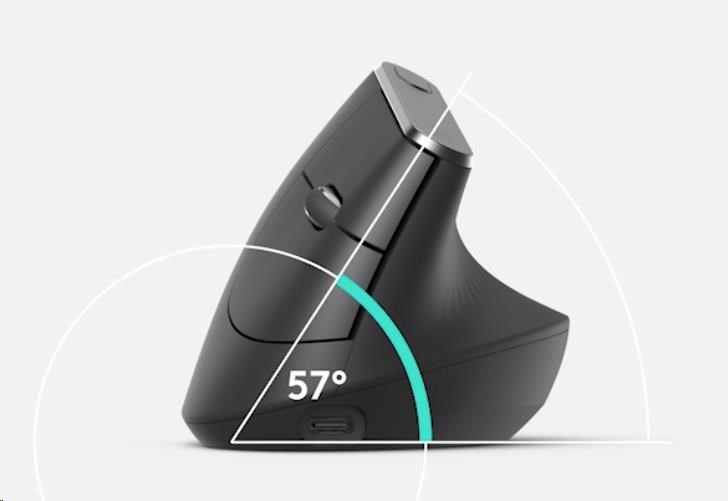 Jedinečný 57° vertikálny uhol modelu MX Vertical znižuje tlak na zápästie, zatiaľ čo palec je pohodlne umiestnený na opierke pre palec.