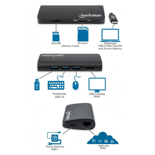 USB 3.2 Gen 1 Type-C Male to HDMI(4K@30Hz) Female, tri porty USB-A SuperSpeed, USB-C Power Delivery (PD 3.0) Port, gigabitový port RJ45 a čítačka kariet SD/MicroSD; hliník, čierna farba