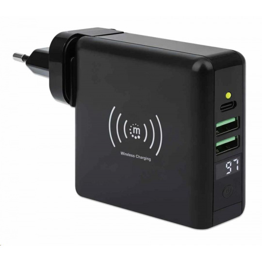 Cestovná sieťová nabíjačka a powerbanka Manhattan 4 v 1 s kapacitou 8 000 mAh vám poskytne neuveriteľne užitočné funkcie v jednom zariadení. Používajte ju ako nástennú nabíjačku USB na nabíjanie smartfónov, tabletov, elektronických čítačiek, slúchadiel a ďalších zariadení z dvoch portov USB-A a jedného portu USB-C s výkonom na port až 5 V/2.4 A. Môžete tiež úplne vynechať káble a nabíjať kompatibilné mobilné zariadenia na 5 W bezdrôtovej nabíjacej podložke. Pre ešte väčšie pohodlie vám tento univerzálny akumulátor umožňuje nabíjať na cestách bez pripojenia do zásuvky, pretože je to zároveň powerbanka s kapacitou 8 000 mAh. Praktický digitálny číselný displej vám umožní kedykoľvek skontrolovať zostávajúci stav batérie. Powerbanku môžete dobíjať priamo cez sieťovú zásuvku alebo cez port USB-C. Ak cestujete do zahraničia, určite sa vám bude páčiť skladacia zástrčka pre USA a vymeniteľné zástrčky pre Veľkú Britániu a EÚ, ktoré vám umožnia nabíjať zariadenia v mnohých regiónoch, ktoré ponúkajú tieto typy zásuviek.
