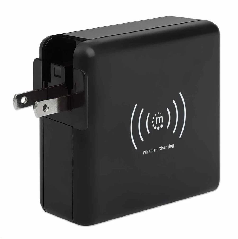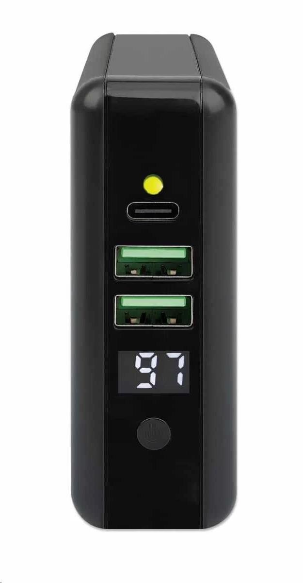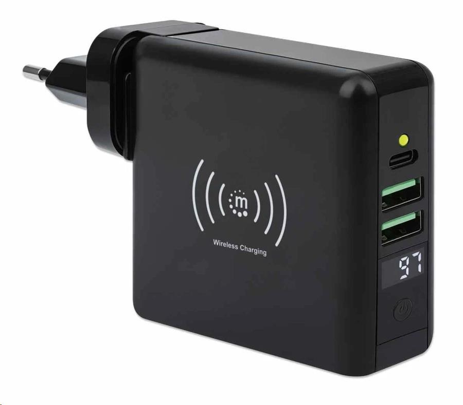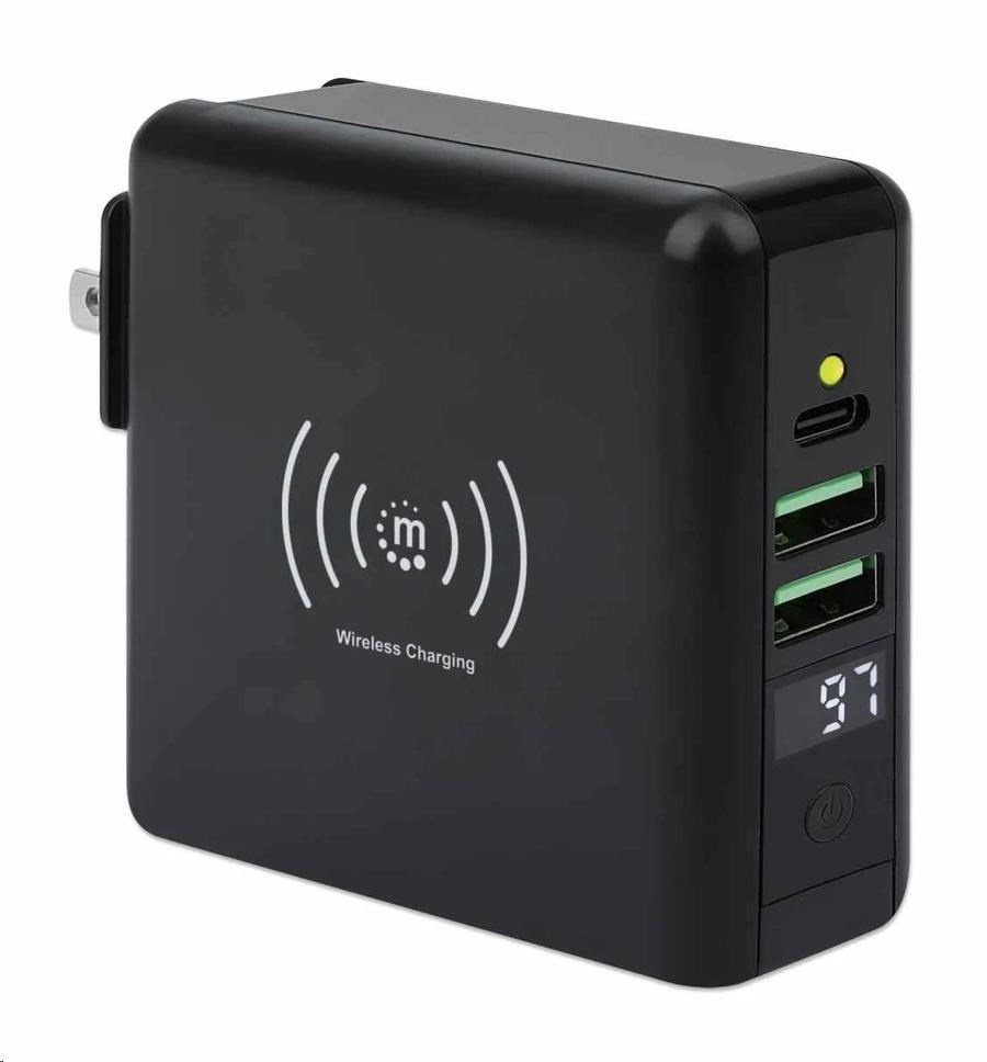 Cestovná sieťová nabíjačka a powerbanka Manhattan 4 v 1 s kapacitou 8 000 mAh vám poskytne neuveriteľne užitočné funkcie v jednom zariadení. Používajte ju ako nástennú nabíjačku USB na nabíjanie smartfónov, tabletov, elektronických čítačiek, slúchadiel a ďalších zariadení z dvoch portov USB-A a jedného portu USB-C s výkonom na port až 5 V/2.4 A. Môžete tiež úplne vynechať káble a nabíjať kompatibilné mobilné zariadenia na 5 W bezdrôtovej nabíjacej podložke. Pre ešte väčšie pohodlie vám tento univerzálny akumulátor umožňuje nabíjať na cestách bez pripojenia do zásuvky, pretože je to zároveň powerbanka s kapacitou 8 000 mAh. Praktický digitálny číselný displej vám umožní kedykoľvek skontrolovať zostávajúci stav batérie. Powerbanku môžete dobíjať priamo cez sieťovú zásuvku alebo cez port USB-C. Ak cestujete do zahraničia, určite sa vám bude páčiť skladacia zástrčka pre USA a vymeniteľné zástrčky pre Veľkú Britániu a EÚ, ktoré vám umožnia nabíjať zariadenia v mnohých regiónoch, ktoré ponúkajú tieto typy zásuviek.