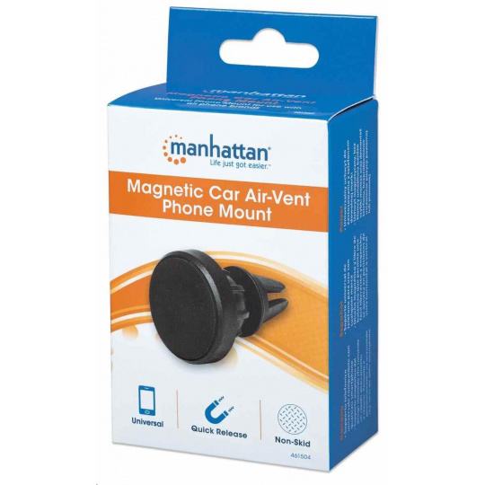 Magnetický držiak telefónu do auta Manhattan Air-Vent možno použiť so všetkými telefónmi a inými zariadeniami na pohodlné a bezpečné upevnenie zariadenia na cestách. Držiak telefónu ponúka dve rôzne veľkosti klipov, takže ho môžete ľahko nainštalovať priamo do vetracieho otvoru väčšiny vozidiel. Priložené magnetické podložky umožňujú pripevnenie zariadenia na výšku aj na šírku. Nastaviteľný, uzamykateľný guľový kĺb ponúka možnosť otáčania o 360°, takže si môžete základňu nakloniť, ako uznáte za vhodné, a vďaka zabudovanej protišmykovej podložke zostane vaše zariadenie v bezpečí pred vibráciami na ceste a nečakanými nárazmi.