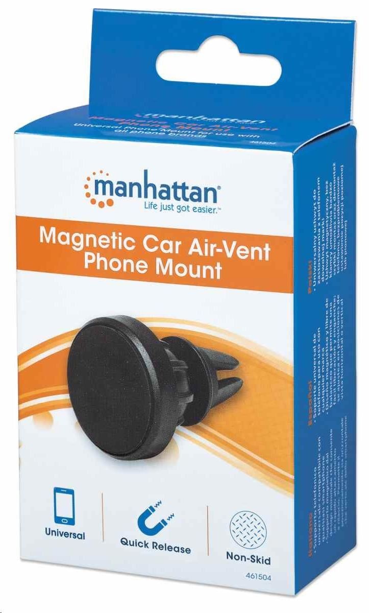 Magnetický držiak telefónu do auta Manhattan Air-Vent možno použiť so všetkými telefónmi a inými zariadeniami na pohodlné a bezpečné upevnenie zariadenia na cestách. Držiak telefónu ponúka dve rôzne veľkosti klipov, takže ho môžete ľahko nainštalovať priamo do vetracieho otvoru väčšiny vozidiel. Priložené magnetické podložky umožňujú pripevnenie zariadenia na výšku aj na šírku. Nastaviteľný, uzamykateľný guľový kĺb ponúka možnosť otáčania o 360°, takže si môžete základňu nakloniť, ako uznáte za vhodné, a vďaka zabudovanej protišmykovej podložke zostane vaše zariadenie v bezpečí pred vibráciami na ceste a nečakanými nárazmi.