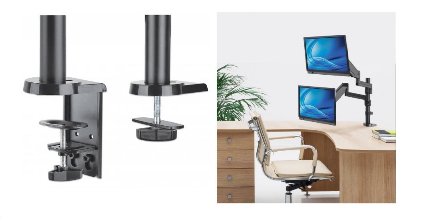 Univerzálny plynový pružinový držiak Manhattan pre dva monitory bezpečne udrží dva 17" až 32" televízory alebo monitory. Keďže na uchytenie displejov sa používajú plynové pružiny, ramená stačí len ľahký dotyk, aby ste ich posunuli do najlepších pozorovacích uhlov pre vaše účely. Vysokokvalitná hliníková a oceľová konštrukcia držiaka vám poskytne roky spoľahlivej prevádzky. Univerzálny držiak Manhattan s plynovou pružinou a dvoma monitormi je ideálny na inštaláciu na veľký stôl a umožňuje vám využiť väčší rozsah pohybu, aby ste mali viac priestoru na prácu.