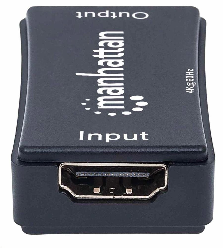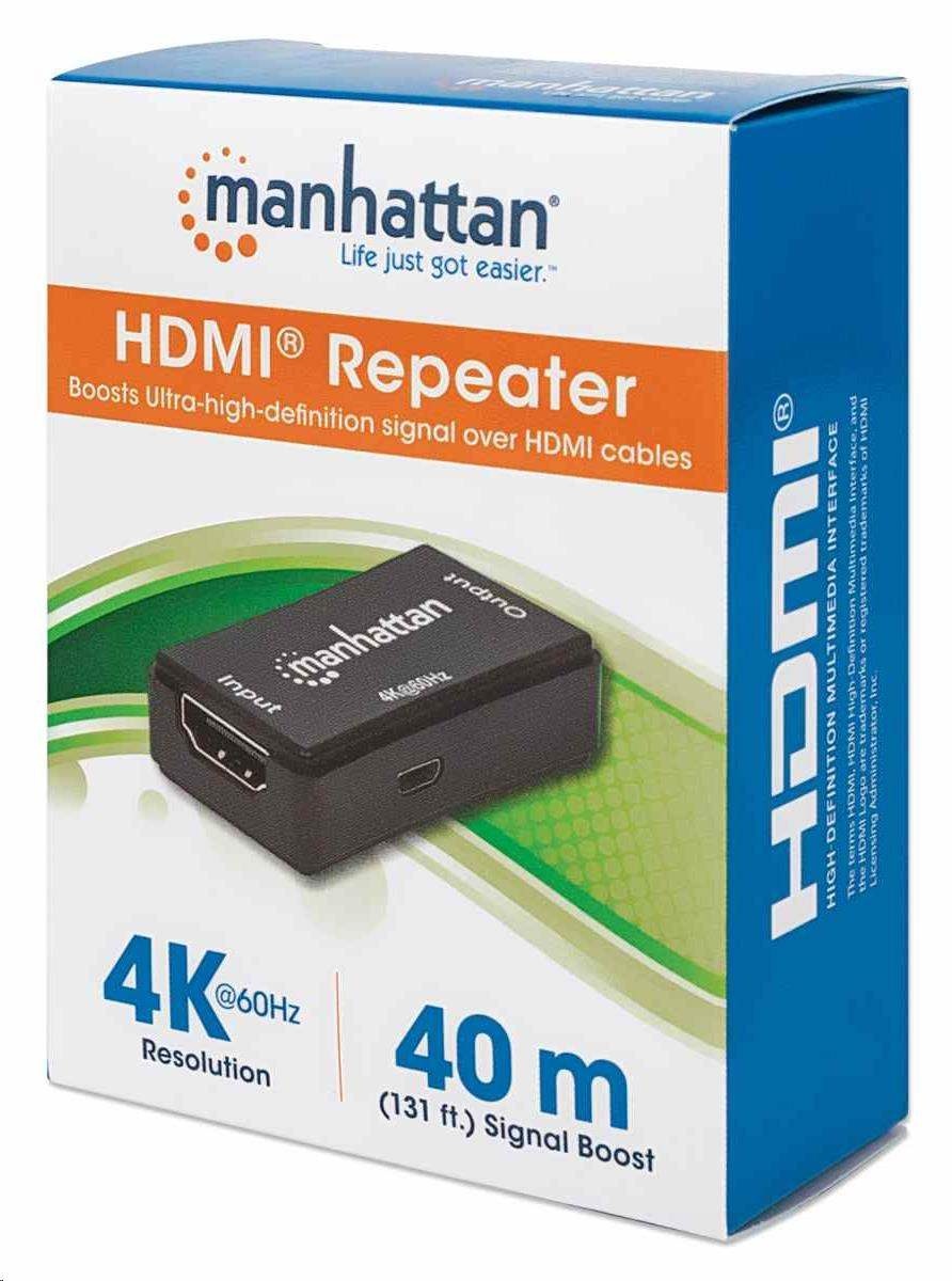 Manhattan 4K HDMI Repeater rozširuje dosah signálu HDMI dekódovaním a regeneráciou v rozlíšení 4K@60 Hz prakticky z akéhokoľvek zdroja HDMI (PlayStation, Xbox, Blu-ray prehrávač, satelitný prijímač, digitálny rekordér atď.) pomocou existujúcich káblov HDMI. Opakovač je navrhnutý na inštaláciu typu plug-and-play a zosilňuje slabé signály s cieľom znížiť alebo odstrániť šum, degradáciu alebo iskrenie obrazu na HD displeji alebo projektore. Súčasťou balenia je aj ďalší port USB na zvýšenie napájania zdrojov videa, ktoré potrebujú prekonávať väčšie vzdialenosti.