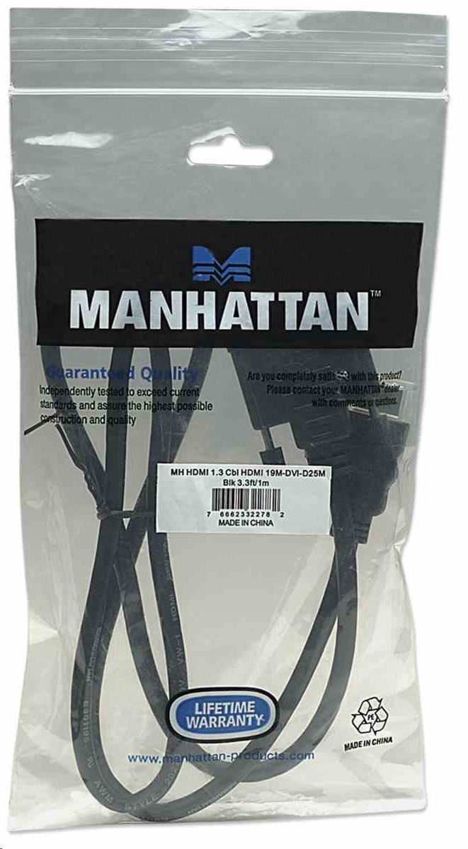 Kábel Manhattan HDMI na DVI-D poskytuje najjasnejšie, najpresnejšie farby a najostrejšie detaily pri pripojení televízora s vysokým rozlíšením, LCD alebo plazmového displeja, digitálneho satelitného prijímača, DVD prehrávača, digitálneho projektora alebo iných zobrazovacích zariadení vybavených rozhraním DVI alebo HDMI. Kábel Manhattan HDMI na DVI-D je skonštruovaný a vyrobený z kvalitných materiálov na zabezpečenie spoľahlivého prenosu v aplikáciách digitálneho videa. Úplné fóliové a opletené tienenie, tvarované topánky s odľahčením od pnutia, ochranné PVC plášte a pozlátené spoje pomáhajú zabezpečiť maximálnu vodivosť a čistý, jasný prenos signálu so zníženým rušením a skreslením EMI.