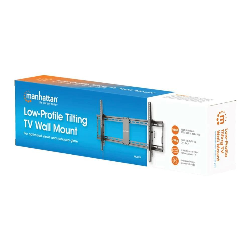 This tilting TV Wall Mount from Manhattan safely holds your TV and offers a toolless +3 to -12° tilt adjustment with the turn of a knob for optimized views. Constructed of 2 mm thick reinforced powder-coated steel, it fits flat and curved LCD, OLED or plasma TVs up to 100" and weighing up to 70 kg (154 lbs.) with VESA compliance up to 800x400. You're all set for a confident above-the-floor installation with an included bubble level that helps get the mount perfectly horizontal on the wall, and intuitive snap-in spring locks with release cords let you easily and securely put the TV in place. It's ideal for residential, office, hospitality, classroom, conference room, digital signage and other commercial applications. An anti-theft opening allows you to attach a padlock to prevent your valuable display from being removed and stolen. p>