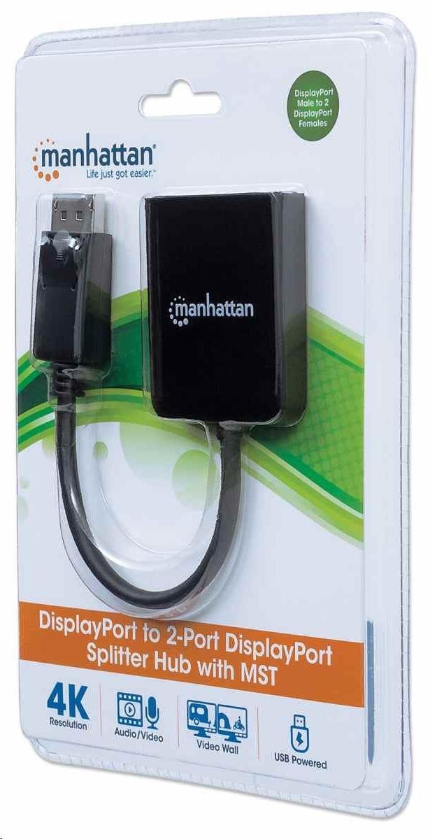 Rozbočovač Manhattan DisplayPort na duálny DisplayPort - MST prenáša signál 4K DisplayPort (DP) z jedného zdroja UHD až na dva displeje UHD.