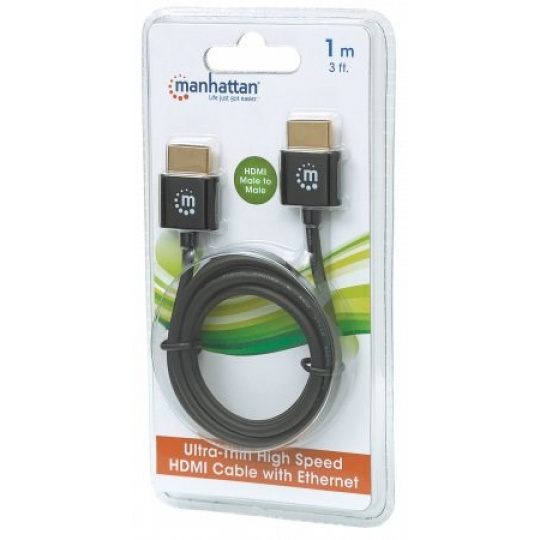 HDMI sa stalo štandardným digitálnym pripojením, ktoré poskytuje najkvalitnejší zvukový a obrazový signál prostredníctvom jediného kábla. Vďaka ultratenkej konštrukcii odolnej voči zamotaniu, pozláteným kontaktom a pevnému, ale tenkému PVC plášťu sú ultratenké vysokorýchlostné káble HDMI Manhattan starostlivo skonštruované tak, aby spĺňali vyvíjajúce sa potreby trhu s ultra vysokým rozlíšením. Vysokorýchlostné káble HDMI Manhattan poskytujú najvyššie možné rozlíšenie 4K x 2K, spätný zvukový kanál a šírku pásma 18 Gb/s pri frekvencii 600 MHz. Tieto vysokokvalitné káble poskytujú video s veľmi vysokým rozlíšením a viackanálový digitálny zvuk so zvýšenými výkonnostnými charakteristikami a vyššou presnosťou. Rozšírené funkcie zahŕňajú pripojenie k internetu pre zariadenia domácej zábavy pomocou jediného pripojenia HDMI. Vďaka jedinečnému dizajnu tohto kábla sa s ním navyše ľahko manipuluje a tvaruje bez obáv zo zasekávania a zamotávania.