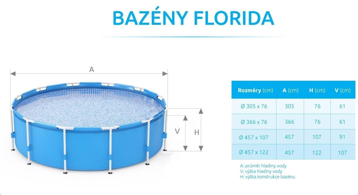 Bazén Marimex Florida patrí medzi veľmi obľúbené nadzemné bazény v Českej republike. Kúpanie vo vlastnom veľkom bazéne si môže dopriať naozaj každý. Hlavným benefitom bazéna Florida je výhodná cena, jednoduchá údržba, stabilita konštrukcie, široká hladina vody a ľahké spustenie do prevádzky. Stačí len pripraviť miesto na bazén, rozvinúť bazénovú podložku, rozbaliť bazén, zostaviť opornú konštrukciu, na ktorú sa navlečie bazénová fólia. Od vybalenia bazéna môžete do 30 minút napúšťať vodu.