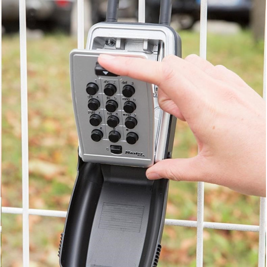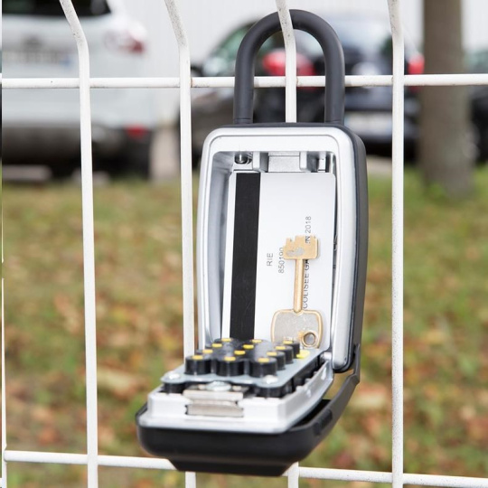 Stredná bezpečnostná prenášateľná skrinka s okom na uloženie kľúčov s kovovým telom šírky 79 mm pre jej dlhú životnosť. Prestante skrývať svoje kľúče pod rohožkou alebo pod kvetináčom. Táto skrinka s veľkými tlačidlami je veľmi ľahko použiteľná aj za zhoršených svetelných podmienok, s rukavicami, staršími ľuďmi alebo deti. Nastavte si vlastnú kombináciu až 12 písmen, číslic alebo obojím pre bezkľúčové pohodlie a zvýšenie bezpečnosti. Pohodlný mechanizmus uzamknutia tlačítka vo známej podobe alfanumerickej klávesnice. Ochranný poveternostný kryt zabraňuje zamrznutiu a zaseknutiu. Tvarované telo a vinylové pásy bránia poškriabaniu.