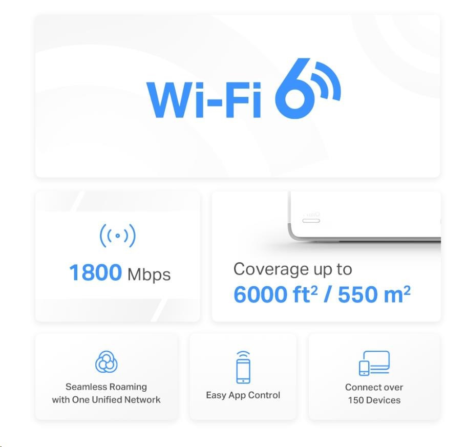 - Pokrytie celej domácnosti – pokrytie priestoru až 550 m2 (6 000 štvorcových stôp) vysokorýchlostnou sieťou Wi-Fi, ktorá eliminuje mŕtve zóny Wi-Fi pokrytia vo vašej domácnosti.