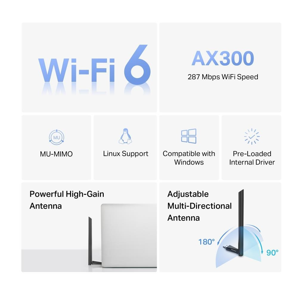 | Balenie obsahuje | AX300 High-Gain Wi-Fi 6 Wireless USB adaptér (MA14H) Rýchly sprievodca inštaláciou |