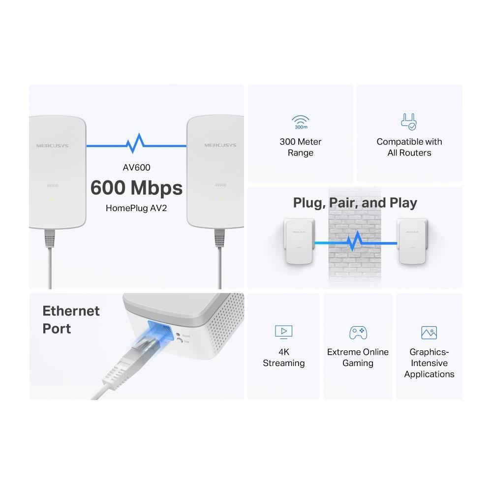 MERCUSYS MP300 KIT Základná sada Gigabit Powerline adaptérov AV600 600 Mbps vysokorýchlostný prenos: Rýchly a stabilný prenos vďaka pokročilej technológii HomePlug AV2‡ Rýchle káblové pripojenie: 10/100 Mbps port poskytuje vysokorýchlostný internet pre PC, IPTV a herné konzoly Plug & Play: Nie je potrebné žiadne... viac
