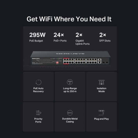 MERCUSYS switch MS128GP (24xGbE,24xPoE+,2xGbE,2xSFP,295W)