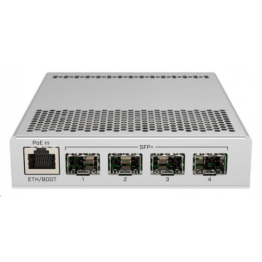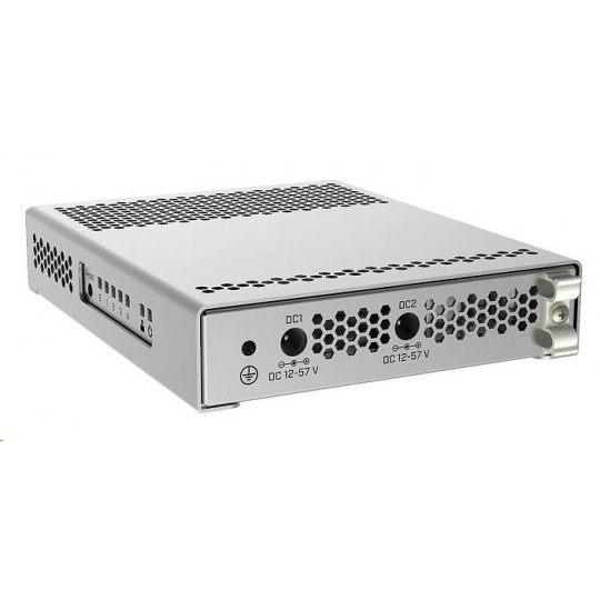 CRS305-1G-4S+IN je kompaktný, ale výkonný prepínač so štyrmi portami SFP+ s rýchlosťou 10 Gb/s/port. Okrem optických portov má zariadenie aj jeden gigabitový ethernetový port s podporou POE IN na jednoduchý prístup k zariadeniu, konfiguráciu zariadenia alebo konverziu na metalickú linku. Na redundantné napájanie sú k dispozícii dva konektory DC. Vypínač je veľmi elegantný, kompaktný a jeho kovové puzdro bez ventilátora zaručuje tichú prevádzku.
