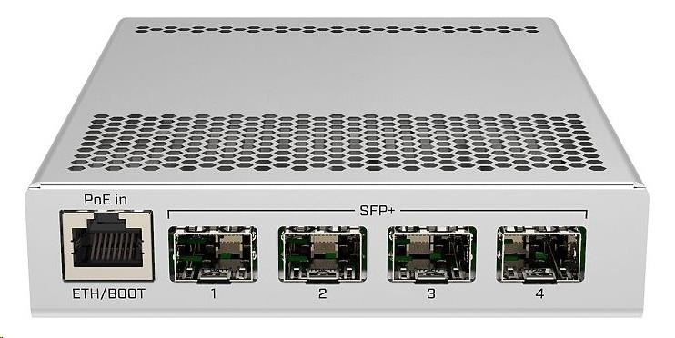 CRS305-1G-4S+IN je kompaktný, ale výkonný prepínač so štyrmi portami SFP+ s rýchlosťou 10 Gb/s/port. Okrem optických portov má zariadenie aj jeden gigabitový ethernetový port s podporou POE IN na jednoduchý prístup k zariadeniu, konfiguráciu zariadenia alebo konverziu na metalickú linku. Na redundantné napájanie sú k dispozícii dva konektory DC. Vypínač je veľmi elegantný, kompaktný a jeho kovové puzdro bez ventilátora zaručuje tichú prevádzku.