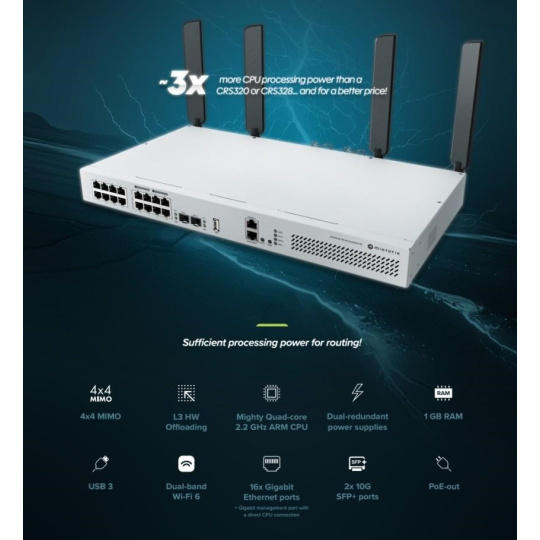 Switch, který umí víc než jen přepínat. Nyní s nejvýkonnějším 4x4 MIMO Wi-Fi 6 a dostatečným výkonem i pro směrování! Hlavní vlastnosti: 16× Gigabit Ethernet portů (8× s PoE-out) 2× 10G SFP+ porty PoE-out – celkový výkon až 150 W Výkonný čtyřjádrový ARM CPU 2,2 GHz 1 GB RAM, 128 MB NAND L3 HW Offloading USB 3.0 typu A Gigabit management port přímo napojený na CPU Dual-band 4x4 MIMO Wi-Fi 6 (2,4 GHz & 5 GHz) Redundantní napájení (2× AC vstup) RouterOS v7 (Licence L5) Technické specifikace: CPU: Quad-Core IPQ-8072A, 2208 MHz Architektura CPU: ARM 64bit RAM: 1 GB DDR3 Úložiště: 128 MB NAND Ethernet porty: 17× 1G SFP+ porty: 2× 10G USB: 1× USB 3.0 Typ A Switch čip: 98DX226S Wi-Fi 2,4 GHz: 802.11b/g/n/ax (QCN-5024, 4×4, zisk 5 dBi) Wi-Fi 5 GHz: 802.11a/n/ac/ax (QCN-5054, 4×4, zisk 6 dBi) Rozměry: 44 × 250 × 443 mm (s anténami 210 × 250 × 443 mm) Operační teplota: -20 °C až +70 °C Napájení: 2× AC vstup 100–240 V Max. spotřeba (bez zátěže): 43 W Max. spotřeba (celkem): 227 W PoE-out: 802.3af/at, 24V Passive, porty Ether9–Ether16 Max. výstup na port: 1,1 A (<30 V), 0,56 A (>30 V) Celkový výkon PoE: 150 W Balení obsahuje: napájecí kabel, montážní sadu. Upozornění: Výrobce MIKROTIK nevztahuje záruku na zařízení poškozená přepětím. Zařízení je třeba na vstupech adekvátně chránit proti indukovanému elektrostatickému přepětí či přepěťovým špičkám na silovém vedení. Při venkovních instalacích je třeba používat stíněnou kabeláž (FTP/SFTP), příslušné přepěťové ochrany (pokud nejsou integrovány) a provést korektní a efektivní uzemnění. Zařízení vždy provozujte s poslední výrobcem publikovanou verzí (výrobcem označenou "Stable") operačního systému RouterOS. Taková verze garantuje nejoptimálnější funčknost, obsahuje opravené chyby z verzí předchozích a výkonová vylepšení. .