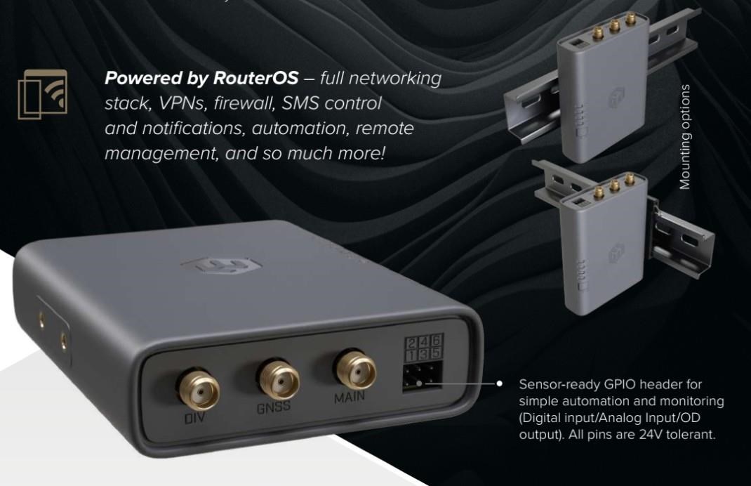 Brána IoT průmyslové třídy s LTE/BLE/GNSS konektivitou pro inteligentní sledování majetku, vzdálené monitorování a efektivní automatizaci. Původně navrženo pro kávovary a prodejní automaty – ideální pro všechny druhy průmyslové automatizace. KNOT Embedded LTE4 je malá, ale výkonná průmyslová LTE brána určená pro integrátory, specialisty na automatizaci a tvůrce systémů IoT. Hodí se do stísněných prostor, montuje se přímo na DIN lištu a poskytuje spolehlivé připojení LTE Cat4 s podporou Bluetooth a GNSS. Použijte ji jako primární bránu, záložní spojení nebo uzel pro sběr dat IoT – vše je poháněno systémem RouterOS pro maximální flexibilitu. Funkce a vlastnosti KNOT Embedded LTE4 je určen pro prostředí, kde je omezený prostor, ale spolehlivost je zásadní: • Infrastruktura inteligentních měst (parkování, senzory, měření) • Monitorování kávovarů a prodejních automatů • Skříně pro průmyslovou automatizaci • Monitorování životního prostředí a veřejných služeb • Sledování vozidel nebo majetku pomocí GNSS • Prodejní kiosky, platební terminály, digitální značení • Záložní připojení LTE pro stávající zařízení Ethernet • Brány IoT pro senzory a majáky BLE Upozornění: IoT brána není plnohodnotným LTE routerem. SIM karta není určená pro vytáčení připojení, ale pro komunikaci v síti IoT. IoT brána nedisponuje LTE modemem. Technické specifikace: Product code: EC25-EU&KNe CPU: ARM 32-bit Cortex A7 up to 1.2 GHz Size of RAM: 256 MB RAM type: DDR Storage: 512 MB Number of 1G Ethernet ports: 1 GNSS interface model: EC25-EU GNSS standard: BeiDou, Galileo, GPS, Glonass RF connector type: SMA female SIM slots: Nano SIM, eSIM Bluetooth version: 5.4 MIMO DL: 2x2 MIMO UL: 1x1 Dimensions: 90 x 70 x 22 mm Operating system: RouterOS v7, License level 3 Operating temperature: -40°C to +70°C Napájení: Number of DC inputs: 2 (PoE-In, USB Type-C (powering only)) PoE-In input Voltage: 12-57 V USB Type-C input voltage: 5 V Power adapter nominal voltage: 5 V Power adapter nominal current: 0.8 A PoE-in: 802.3af/at Max power consumption: 7 W EC25-EU (EMEA) podporovaná pásma: LTE modem: EC25-EU TAC: 86554604 LTE Category: 4 (150Mbps Downlink, 50Mbps Uplink) LTE FDD bands: 1 (2100MHz) / 3 (1800MHz) / 7 (2600MHz) / 8 (900 MHz) /20 (800MHz) / 28A (700 MHz) LTE TDD bands: 38 (2600MHz) / 40 (2300MHz) / 41 (2500MHz) 3G Category: R8 (42.2Mbps Downlink, 5.76Mbps Uplink) 3G bands: 1 (2100MHz) / 8 (900MHz) 2G Category: Class12 2G bands: 3 (1800MHz) / 8 (900MHz) Internet věcí (anglicky Internet of Things, zkratka IoT) je termínem pro moderní přístroje ovladatelné i na dálku pomocí internetu. Snadno je tak obsloužíte pomocí svého chytrého telefonu nebo je jednoduše připojíte k centrální jednotce. Umožní tak snadno zautomatizovat věci, o které byste se jinak museli postarat sami. Jedná se o technologický koncept umožňující realizaci takzvaného "inteligentního domu" (automatické zhasínání světel, ovládání vytápění apod.). Umožňuje řídit klimatizaci, vyhřívání vašeho bazénu, ohřev vody, pečovat o vaše akvárium, obsluhovat nastavení alarmu či mechanických zámků. Pokud si nejste jistí, zda jste v ranním shonu vypnuli žehličku, můžete na dálku odpojit od sítě jednotlivé zásuvky. Vaše lednička vás dokáže upozornit na chybějící potraviny a připravovat aktualizovaný nákupní seznam. Upozornění Výrobce Mikrotik neposkytuje záruku na zařízení poškozená přepětím. Zařízení je třeba adekvátně chránit proti indukovanému elektrostatickému přepětí či přepěťovým špičkám na silovém vedení. Pro venkovní instalace používat výhradně stíněnou kabeláž (FTP/SFTP), jednotky korektně uzemnit (užití integrovaného zemnícího členu, ethernetové přepěťové ochrany). Zařízení vždy provozujte s poslední výrobcem publikovanou verzí (výrobcem označenou "Stable") operačního systému RouterOS. Taková verze garantuje nejoptimálnější funčknost, obsahuje opravené chyby z verzí předchozích a výkonová i funční vylepšení.Taková verze garantuje nejoptimálnější funčknost, obsahuje opravené chyby z verzí předchozích a výkonová vylepšení.