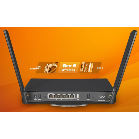 Popis produktu Router do domácností či malých firiem s označením hAP ax3 alebo C53UiG+5HPaxD2HPaxD má L6 licenciu, desktopové prevedenie a obsahuje 5 Gigabitových portov, z ktorých 1 port podporuje PoE in aj PoE out a dokonca aj 2.5Gigabit Ethernet. Okrem toho má router dve rádiové časti s podporou štandardov 802.11a/b/g/n/ac/ax, čo umožňuje súčasný prevádzku v oboch pásmach a dve odnímateľné všesmerové anténky. V pásme 2,4 GHz je podporované 2×2 MIMO s prenosovou rýchlosťou až 574 Mbps a v pásme 5 GHz 2×2 MIMO s prenosovou rýchlosťou 1200 Mbps. Zisk dvoch odnímateľných bezdrôtových antén je 3.3 dBi (2.4 GHz) a 5.5 dBi (5 GHz). Kľúčové vlastnosti (1) 2.5 Gigabit Ethernet + (4) Gigabit Ethernet Podpora PoE in/out na 1. porte 1800 MHz CPU - 4 jadrá, ARM 64bitová architektúra 128MB NAND, 1GB RAM Wi-Fi - 2,4 GHz (2×2 MIMO, 574 Mbps, 802.11ax), 5 GHz (2×2 MIMO, 1200 Mbps, 802.11ax) Podpora WPA3 šifrovania RouterOS level 6 (2) odnímateľné antény, zisk 5.5 dBi Štandard 802.11ax zvyšuje rýchlosť až o 40 % v pásme 5 GHz a až o 90 % v pásme 2,4 GHz Obsah balenia Zariadenie (2) Anténa Napájací adaptér 24 V/1,5 A Plastový stojan + skrutky Technické parametre Bezdrôtové vlastnosti Bezdrôtové frekvencie: 2.4 + 5 GHz (dual band) WiFi štandardy: 802.11ac, 802.11ax, 802.11n, 802.11a, 802.11b/g MU-MIMO: Áno Prenosová rýchlosť - 5GHz [Mb/s]: 1200 Prenosová rýchlosť - 2.4GHz [Mb/s]: 574 Vysielací výkon 2.4GHz [dBm]: 27 Vysielací výkon 5GHz [dBm]: 28 Šifrovanie: WPA, WPA2, WPA3 2.4GHz MIMO: 2 x 2 5GHz MIMO: 2 x 2 Typ antény: Odnímateľná Počet odnímateľných antén: 2 Zisk antény [dBi]: 3,3, 5,5 Konektory a rozhrania Počet portov USB 3.0: 1 VF konektory: (2) RSMA female Rýchlosť LAN: (1) 1G/2.5Gbps + (4) 10/100/1000Mbps Gigabit LAN: Áno USB: Áno Napájanie Napájanie cez PoE: 18 .. 28V DC Typy PoE: PoE-Out + PoE-In Počet PoE Out portov: 1 PoE rozpočet [W]: 15 Max. spotreba energie [W]: 15 Napájanie cez konektor/skrutku: 12 .. 28V DC Fyzické vlastnosti Prevedenie: Desktop Použitie: Vnútorné Prevádzková teplota [°C]: -40 až 70 Šírka [mm]: 251 Výška [mm]: 39 Hĺbka [mm]: 130 Hardware CPU: IPQ-6010 Frekvencia CPU [MHz]: 1800 Počet CPU jadier: 4 Interné úložisko [MB]: 128 RAM [MB]: 1024 Softvér Operačný mód: AP Router Operačný systém: RouterOS - L6 Podpora IPv6: Áno Východisková IP adresa: 192.168.88.1 Východiskové meno a heslo: admin / -