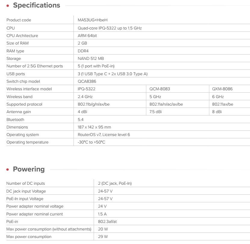 HAP be3 Media poskytuje skutečný výkon Wi-Fi 7 v pásmech 2,4, 5 a 6 GHz. Očekávejte vyšší propustnost, nižší latenci, vylepšené zabezpečení a lepší spektrální účinnost. Široké pásmo 6GHz nabízí čistší spektrum, což pomáhá snížit přetížení v rušných prostředích. Ideální řešení pro provoz s více zařízeními - domácí laboratoř, pracovní stanice, VR headsety, zálohy NAS, synchronizaci v cloudu nebo streamování médií ve vysokém rozlišení. S HAP be3 Media vše může běžet současně, aniž by se zařízení navzájem přetahovala o vysílací čas. Více pásem znamená větší kapacitu, plynulejší výkon a bezdrátové připojení, které konečně drží krok s moderními pracovními zatíženími. 2,5 Gigabit Ethernet na všech portech Ultrarychlé připojení k internetu, NAS servery, pracovní stanice – nyní poběží vše a bez limitů. Moderní domácí mediální centrum Díky USB-C, dvěma portům USB-A a slotu pro karty microSD se hAP be3 Media stane srdcem vašeho lokálního úložiště médií. Použijte flash úložiště pro zálohy, fotografie, záznamy z domácího kamerového systému nebo soukromý rodinný cloud. Samostatně hostované správce hesel, dokumenty a služby – tak to bude v roce 2026, pokud vám záleží na soukromí a bezpečnosti. Ukládejte data automatizace a pracovní zatížení kontejnerů, aniž byste se spoléhali na externí servery. Vše zůstává rychlé, lokální a plně pod vaší kontrolou. Díky aplikaci MikroTik BackToHome a vylepšené funkci sdílení souborů v WinBoxu můžete sdílet velké soubory, aniž byste se museli obávat vypršení platnosti odkazů, zpoždění nebo narušení soukromí. Integrace chytré domácnosti nikdy nebyla snazší Díky Wi-Fi 7, Bluetooth 5.4 a RouterOS v7 poskytuje hAP be3 Media pevný základ pro moderní chytré domácnosti. Vestavěné rádio Thread a plná podpora kontejnerů umožňují uživatelům nasadit řešení domácí automatizace Matter-over-Thread, která zůstávají lokální, soukromá a plně přizpůsobitelná. Čtyřjádrový výkon pro kreativní pracovní postupy Díky modernímu čtyřjádrovému procesoru s frekvencí 1,1 GHz a efektivní architektuře ARM64 je hAP be3 Media připraven na mnohem více než jen tradiční síťové připojení. Kontejnery, místní řídicí panely, skriptování, složitá pravidla brány firewall, šifrování, více VPN, BGP a pokročilé směrování – to vše běží hladce na jediném kompaktním zařízení. Jedná se o výkon, na který se můžete dnes spolehnout, a kapacitu, která bude i v příštích letech předstihovat vaše každodenní potřeby. Jako vždy je vám k dispozici kompletní sada funkcí hAP be3 Media bez jakýchkoli předplatných nebo platebních bariér. Kontejnery, to je oč tu běží ... Do WinBoxu je nově přidána jednoduchá stránka pro nastavení kontejnerů jedním kliknutím, kde můžete povolit požadované kontejnerové aplikace. Kontejnery otevírají dveře k celé řadě nových možností - • vizualizace topologie sítě • hostování "lightweight websites" (odlehčených webových stránek) • po provozování vlastních dashboardů, bezpečnostních nástrojů • provoz experimentálních lokálních AI asistentů Technické specifikace: Product code: MA53UG+HbeH CPU: Quad-core IPQ-5322 up to 1.5 GHz CPU Architecture: ARM 64bit Size of RAM: 2 GB RAM type: DDR4 Storage: NAND 512 MB Number of 2.5G Ethernet ports: 5 (1 port with PoE-in) USB ports: 3 (1 USB Type C + 2x USB 3.0 Type A) Switch chip model: QCA8386 Wireless interface model: IPQ-5322 QCM-8083 QXM-8086 Wireless bands: 2.4 GHz / 5 GHz / 6 GHz Supported protocols: 802.11b/g/n/ax/be / 802.11a/n/ac/ax/be / 802.11ax/be Antenna gain: 2,4GHz: 4 dBi; 5GHz: 7.5 dBi; 6GHz: 8 dBi Bluetooth: 5.4 Dimensions: 187 x 142 x 95 mm Operating system: RouterOS v7, License level 6 Operating temperature: -30°C / +50°C Napájení Number of DC inputs: 2 (DC jack, PoE-In) DC jack input Voltage: 24-57 V PoE-In input Voltage: 24-57 V Power adapter nominal voltage: 24 V Power adapter nominal current: 1.5 A PoE-in: 802.3af/at Max power consumption (without attachments): 20 W Max power consumption: 29 W Upozornění: Výrobce Mikrotik neposkytuje záruku na zařízení poškozená přepětím. Zařízení je třeba adekvátně chránit proti indukovanému elektrostatickému přepětí či přepěťovým špičkám na silovém vedení. Pro venkovní instalace používat výhradně stíněnou kabeláž (FTP/SFTP) a jednotky korektně uzemnit (prostřednictvím integrovaného zemnícího členu či použitím ethernetové přepěťové ochrany). Zařízení vždy provozujte s poslední výrobcem publikovanou verzí (výrobcem označenou "Stable") operačního systému RouterOS. Taková verze garantuje nejoptimálnější funčknost, obsahuje opravené chyby z verzí předchozích a výkonová vylepšení..