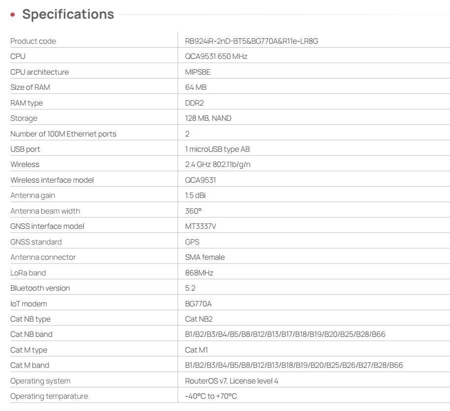 Brána IoT průmyslové třídy pro inteligentní sledování majetku, vzdálené monitorování a efektivní automatizaci - nyní s vylepšeným příjmem LoRa®, souběžným GPS + LTE CAT-M a nižší cenou. KNOT LR8G je kompaktní brána pro sítě založené na technologii LoRa®, která je navržena tak, aby poskytovala cenově dostupné a spolehlivé připojení i v těch nejodlehlejších nebo na infrastrukturu nenáročných prostředích. Podporuje LTE CAT-M1 a NB2, Bluetooth 5.2, 2,4 GHz Wi-Fi, GPS a Ethernet s PoE, což z ní činí flexibilní ústřední prvek pro jakékoli nasazení IoT. Mobilní připojení k internetu CAT-M1 a NB2 umožňuje ušetřit spoustu peněz a vzdáleně monitorovat a spravovat zařízení, aniž byste potřebovali drahé datové tarify nebo plné pokrytí LTE. Ať už sledujete vysoce cenný majetek v nemocnici, spravujete prodejní automat v nákupním centru nebo monitorujete senzory na zemědělském poli - KNOT LR8G vše propojuje a udržuje spojení. Díky spotřebě pouhých 6 W a malým rozměrům (122 × 87 × 26 mm) je zařízení KNOT LR8G ideální pro nasazení tam, kde je omezený prostor, energie i rozpočet, ale ne výkon. Funkce a vlastnosti: Souběžné připojení GPS a LTE CAT-M Sledujte pohybující se prostředky pomocí přesného systému GPS a zároveň udržujte živé připojení LTE CAT-M1. Ideální pro mobilní jednotky, jako jsou servisní vozidla, kontejnery nebo roamingové vybavení v terénu. Všestranné napájení Vyberte si z PoE-in, DC jack nebo MicroUSB - včetně PoE-out na Ether2 pro napájení dalších zařízení. Konektory SMA(F) pro všechna hlavní rozhraní Snadné nastavení antény pro LTE, GPS a LoRa®. Vylepšený příjem 868 MHz LoRa® Zvýšená citlivost pro silnější signál a delší dosah, a to i v prostředí se silným rušením. Nižší cena, stejná spolehlivost Cenově výhodné pro rozsáhlá nasazení bez obětování výkonu. Poháněn systémem RouterOS v7 Pro pokročilé ovládání, vlastní skriptování a pokročilé funkce směrování. Příklady praktického nasazení: Sledování majetku nemocnice Připojte majáky Bluetooth ke kritickému zdravotnickému vybavení. Nainstalujte KNOT LR8G do každého skladovacího prostoru. Při pohybu zařízení KNOT detekuje blízké štítky, sleduje polohu pomocí GPS a odesílá aktualizace přes LTE CAT-M - udržuje aktuální stav inventáře a snižuje počet manuálních kontrol. Zemědělství a odlehlé lokality Nasaďte KNOT ke sběru dat z půdních nebo meteorologických senzorů na venkovských polích. Díky podpoře širokého pásma, příjmu LoRa® a kompatibilitě s GPS je ideální pro sběr dat na velké vzdálenosti a s nízkou spotřebou energie. Monitorování chladicího řetězce Používejte kabelové senzory Modbus ke sledování teploty a vlhkosti uvnitř chladicích kontejnerů. KNOT převádí Modbus na TCP a bezpečně předává data prostřednictvím MQTT nebo HTTPS s využitím nízkopásmového LTE nebo NB-IoT. Průmyslová automatizace Přemostění starších kabelových senzorů a akčních členů do cloudu. Díky podpoře lišty DIN a monitorování GPIO se KNOT snadno integruje do průmyslových rozváděčů nebo výrobních prostředí. Upozornění: IoT brána není plnohodnotným LTE routerem. SIM karta není určená pro vytáčení připojení, ale pro komunikaci v síti IoT. IoT brána nedisponuje LTE modemem. Jak by to všechno fungovalo v reálném životě? Představme si nemocnici. Spousta drahého majetku se pohybuje v obrovských budovách. Nástroje, vybavení, léky, na co si vzpomenete. Všechno se neustále přesouvá. neustále přesouvá. Nemocnice obvykle musí vynakládat spoustu prostředků na kontrolu inventáře. Pojďme to napravit. Umístěte na všechny důležité položky lokalizační Bluetooth čipy. Přidejte zařízení KNOT do každého skladovací místnosti. Nyní vedení nemocnice vždy ví, zda se vybavení vrátilo na své místo. Technické specifikace: Product code: RB924iR-2nD-BT5&BG770A&R11e-LR8G CPU: QCA9531 650 MHz CPU architecture: MIPSBE Size of RAM: 64 MB RAM type: DDR2 Storage: 128 MB, NAND Number of 100M Ethernet ports: 2 USB port: 1x microUSB type AB Wireless: 2.4 GHz 802.11b/g/n Wireless interface model: QCA9531 Antenna gain: 1.5 dBi Antenna beam width: 360° GNSS interface model: MT3337V GNSS standard: GPS Antenna connector: SMA female LoRa band: 868MHz Bluetooth version: 5.2 IoT modem: BG770A Cat NB type: Cat NB2 Cat NB band: B1/B2/B3/B4/B5/B8/B12/B13/B17/B18/B19/B20/B25/B28/B66 Cat M type:: Cat M1 Cat M band :B1/B2/B3/B4/B5/B8/B12/B13/B18/B19/B20/B25/B26/B27/B28/B66 Operating system: RouterOS v7, License level 4 Operating temparature: -40°C to +70°C Napájení: Number of DC inputs: 3 (PoE-In, MicroUSB, DC jack) PoE-In input voltage: 18-57 V MicroUSB input voltage: 5-5 V DC jack input voltage: 12-57 V Power adapter nominal voltage: 24 V Power adapter nominal current: 1.2 A PoE-in: 802.3af/at PoE-out: 802.3af (Ether2) Smart PoE: Injector Max out per port output (input < 30 V): 650 mA Max out per port output (input > 30 V): 450 mA Max power consumption (without attachments): 6 W Max power consumption: 23 W Internet věcí (anglicky Internet of Things, zkratka IoT) je termínem pro moderní přístroje ovladatelné i na dálku pomocí internetu. Snadno je tak obsloužíte pomocí svého chytrého telefonu nebo je jednoduše připojíte k centrální jednotce. Umožní tak snadno zautomatizovat věci, o které byste se jinak museli postarat sami. Jedná se o technologický koncept umožňující realizaci takzvaného "inteligentního domu" (automatické zhasínání světel, ovládání vytápění apod.). Umožňuje řídit klimatizaci, vyhřívání vašeho bazénu, ohřev vody, pečovat o vaše akvárium, obsluhovat nastavení alarmu či mechanických zámků. Pokud si nejste jistí, zda jste v ranním shonu vypnuli žehličku, můžet