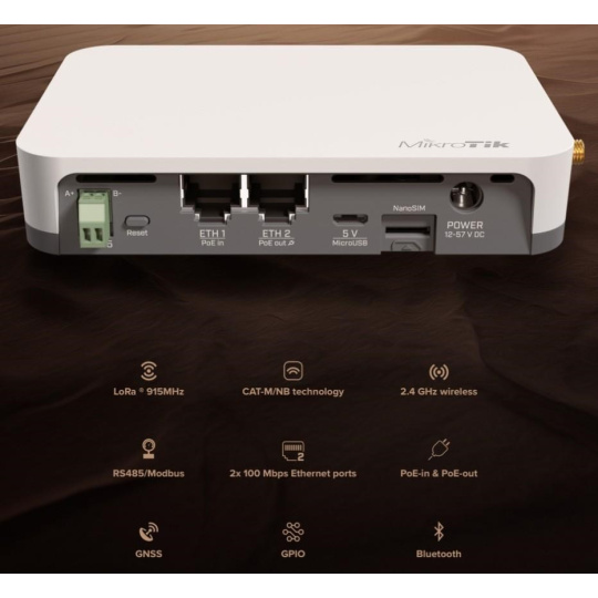 Brána IoT průmyslové třídy pro inteligentní sledování majetku, vzdálené monitorování a efektivní automatizaci - nyní s vylepšeným příjmem LoRa®, souběžným GPS + LTE CAT-M a nižší cenou. KNOT LR9G je kompaktní, ihned použitelná brána pro sítě založené na LoRa®, navržená tak, aby poskytovala cenově dostupnou a spolehlivou konektivitu i v těch nejodlehlejších prostředích. Podporuje LTE CAT-M1 a NB2, Bluetooth 5.2, 2,4 GHz Wi-Fi, GPS a Ethernet s PoE, což z něj činí flexibilní základ pro jakékoli nasazení IoT. Ať už sledujete cenná aktiva v nemocnici, spravujete prodejní automat v nákupním centru nebo monitorujete senzory na zemědělském poli. Funkce a vlastnosti: • Souběžné GPS a LTE CAT-M Sledujte pohybující se aktiva pomocí přesného GPS a zároveň udržujte živé připojení LTE CAT-M1. Ideální pro mobilní jednotky, jako jsou servisní vozidla, kontejnery nebo roamingové terénní zařízení. • Univerzální napájení Vyberte si z PoE-in, DC jack nebo MicroUSB – včetně PoE-out na Ether2 pro napájení dalších zařízení. • SMA konektory pro všechny hlavní rozhraní Snadné nastavení antény pro LTE, GPS a LoRa®. • Vylepšený příjem 915 MHz LoRa® Vylepšená citlivost pro silnější signál a delší dosah, i v prostředí s velkým rušením. • Nižší cena, stejná spolehlivost Cenově výhodné pro rozsáhlá nasazení bez snížení výkonu. • Poháněno RouterOS v7 Pro plnou kontrolu, vlastní skriptování a pokročilé funkce směrování. Příklady praktického nasazení: Sledování majetku nemocnice Připojte majáky Bluetooth ke kritickému zdravotnickému vybavení. Nainstalujte KNOT LR8G do každého skladovacího prostoru. Při pohybu zařízení KNOT detekuje blízké štítky, sleduje polohu pomocí GPS a odesílá aktualizace přes LTE CAT-M - udržuje aktuální stav inventáře a snižuje počet manuálních kontrol. Zemědělství a odlehlé lokality Nasaďte KNOT ke sběru dat z půdních nebo meteorologických senzorů na venkovských polích. Díky podpoře širokého pásma, příjmu LoRa® a kompatibilitě s GPS je ideální pro sběr dat na velké vzdálenosti a s nízkou spotřebou energie. Monitorování chladicího řetězce Používejte kabelové senzory Modbus ke sledování teploty a vlhkosti uvnitř chladicích kontejnerů. KNOT převádí Modbus na TCP a bezpečně předává data prostřednictvím MQTT nebo HTTPS s využitím nízkopásmového LTE nebo NB-IoT. Průmyslová automatizace Přemostění starších kabelových senzorů a akčních členů do cloudu. Díky podpoře lišty DIN a monitorování GPIO se KNOT snadno integruje do průmyslových rozváděčů nebo výrobních prostředí. Upozornění: IoT brána není plnohodnotným LTE routerem. SIM karta není určená pro vytáčení připojení, ale pro komunikaci v síti IoT. IoT brána nedisponuje LTE modemem. Jak by to všechno fungovalo v reálném životě? Představme si nemocnici. Spousta drahého majetku se pohybuje v obrovských budovách. Nástroje, vybavení, léky, na co si vzpomenete. Všechno se neustále přesouvá. neustále přesouvá. Nemocnice obvykle musí vynakládat spoustu prostředků na kontrolu inventáře. Pojďme to napravit. Umístěte na všechny důležité položky lokalizační Bluetooth čipy. Přidejte zařízení KNOT do každého skladovací místnosti. Nyní vedení nemocnice vždy ví, zda se vybavení vrátilo na své místo. Technické specifikace: Product code: RB924iR-2nD-BT5&BG770A&R11e-LR9G CPU: Single-core QCA9531 650 MHz CPU architecture: MIPSBE Size of RAM: 64 MB RAM type: DDR2 Storage: 16 MB, Flash Number of 100M Ethernet ports: 2 MiniPCIe slots: 1 USB slots: 1 microUSB type AB Wireless interface model: QCA9531 Wireless: 2.4 GHz 802.11b/g/n dual-chain Antenna gain: 1.5 dBi Antenna beam width: 360° GNSS standard: GPS LoRa band: 915 MHz Bluetooth version: 5.2 IoT modem: BG770A Cat NB2: B1/B2/B3/B4/B5/B8/B12/B13/B17/B18/B19/B20/B25/B28/B66 Cat M1: B1/B2/B3/B4/B5/B8/B12/B13/B18/B19/B20/B25/B26/B27/B28/B66 Dimensions: 122 x 87 x 26 mm Operating system: RouterOS v7, License level 4 Operating temperature: -40°C to +70°C Napájení: Number of DC inputs: 3 (DC jack, Micro USB, PoE-In) DC jack input Voltage: 12-57 V Micro USB input Voltage: 5-5 V PoE-In input Voltage: 18-57 V Power adapter nominal voltage: 24 V Power adapter nominal current: 1.2 A PoE-In: 802.3af/at PoE-Out: Passive PoE Smart PoE: Injector PoE-Out ports: Ether2 Max out per port output (input < 30 V): 650 mA Max out per port output (input > 30 V): 450mA Max power consumption (without attachments): 6 W Max power consumption: 23 W Internet věcí (anglicky Internet of Things, zkratka IoT) je termínem pro moderní přístroje ovladatelné i na dálku pomocí internetu. Snadno je tak obsloužíte pomocí svého chytrého telefonu nebo je jednoduše připojíte k centrální jednotce. Umožní tak snadno zautomatizovat věci, o které byste se jinak museli postarat sami. Jedná se o technologický koncept umožňující realizaci takzvaného "inteligentního domu" (automatické zhasínání světel, ovládání vytápění apod.). Umožňuje řídit klimatizaci, vyhřívání vašeho bazénu, ohřev vody, pečovat o vaše akvárium, obsluhovat nastavení alarmu či mechanických zámků. Pokud si nejste jistí, zda jste v ranním shonu vypnuli žehličku, můžete na dálku odpojit od sítě jednotlivé zásuvky. Vaše lednička vás dokáže upozornit na chybějící potraviny a připravovat aktualizovaný nákupní seznam. Upozornění Výrobce Mikrotik neposkytuje záruku na zařízení poškozená přepětím. Zařízení je třeba adekvátně chránit proti indukovanému elektrostatickému přepětí či přepěťovým špičkám na silovém vedení. Pro venkovní instalace používat výhradně stíněnou kabeláž (FTP/SFTP), jednotky korektně uzemnit (užití integrovaného zemníc