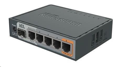 MikroTik RouterBOARD hEX S, 880MHz dvojjadrový CPU, 256MB RAM, 5x LAN, 1x SFP, PoE in/out, USB, microSD slot, vrátane. Licencia L4