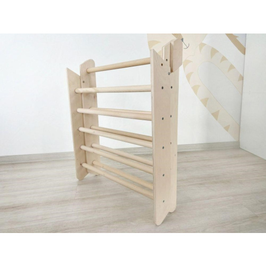 Montessori Piklerov trojuholník ponúka deťom možnosť pohybovej realizácie podľa vlastných schopností a odvahy. Deti sa úplne prirodzene naučia rozoznať a rešpektovať svoje možnosti a mieru odváhy, zároveň ich obratnosť bude stále rásť. Schodík má bezpečnú výšku, príslušenstvo je akurát široké pre pohodlné držanie a navyše je vybavené systémom proti otáčaniu príčníkov.