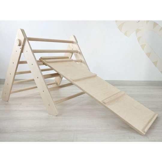 Pri doplnení Piklerovho trojuholníka originálnymi doplnkami získa táto detská lezecká dráha nový, zábavnejší rozmer. K schodíku môžete pripojiť dvojstrannú dosku a premeniť tak lezeckú dráhu na malé detské ihrisko.