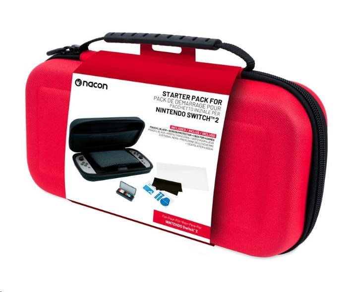 Táto súprava príslušenstva od spoločnosti Nacon určená pre hernú konzolu Nintendo Switch 2 obsahuje pevný prepravný obal, tvrdené ochranné sklo a praktické puzdro na uloženie ďalších herných kariet.