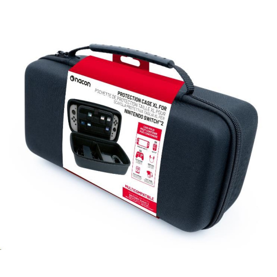 Toto veľké ochranné puzdro od spoločnosti Nacon navrhnuté na mieru pre hernú konzolu Nintendo Switch 2 ocení každý hráč, ktorému nestačí menšie prepravné puzdro určené na prenášanie konzoly so základným príslušenstvom. Oproti nemu ponúka toto väčšie puzdro dostatok miesta nielen pre konzolu a napájací adaptér, ale aj pre HDMI kábel a držiak Joy-Con 2 Grip alebo ovládač Nintendo Switch 2 Pro Controller, prípadne dvojicu ďalších ovládačov Joy-Con 2. Vzhľadom na väčšie rozmery potom toto puzdro obsahuje aj dodatočnú mäkkú výstelku, ktorá na cestách ešte lepšie chráni konzolu aj všetko uložené príslušenstvo. Na spodnej strane veľkého oddielu chrániaceho obrazovku konzoly pred poškrabaním sa navyše nachádza rovných desať kapsičiek pre uloženie kariet s vašimi obľúbenými hrami. Puzdro je zároveň kompatibilné s hernými konzolami Switch, Switch Lite aj Switch – OLED Model.